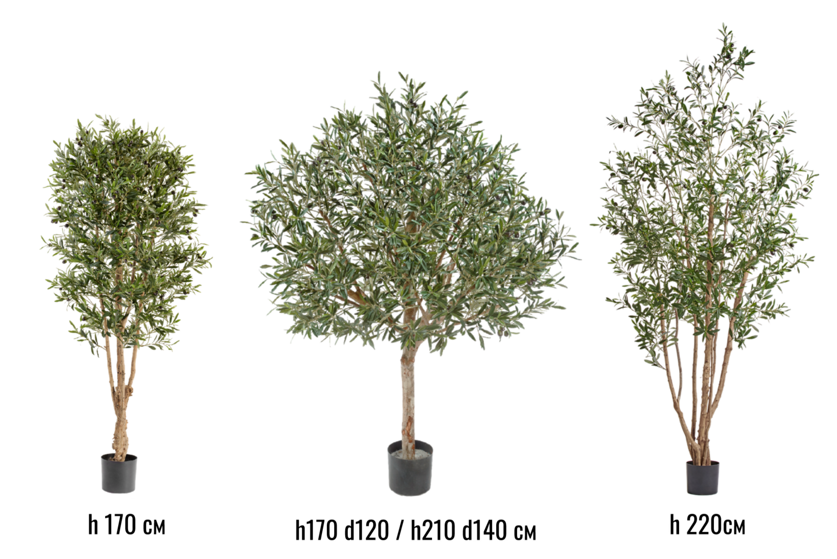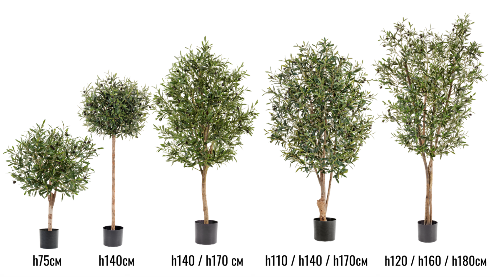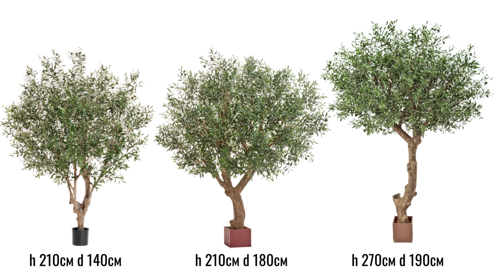 Благодаря несомненной популярности под заказ доступно множество моделей от изящных веточек до 3х метровых деревьев. Наши искусственные оливы лучшее по качеству из представленных на рынке. Все они выглядят как живые и позволяют добавить в интерьер дома или коммерческого пространства нотку вечно-зеленого Средиземноморья.